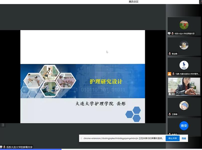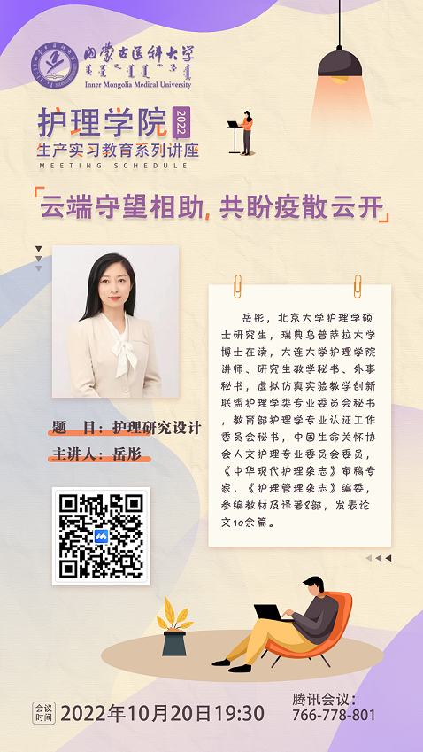 根据学校关于疫情防控工作的总体安排,我院开启了本科实习线上教学工作,确保疫情防控工作和本科实习教学工作两不误,同时为了最大限度降低疫情对学院生产实习教学的影响,丰富线上实习教学内容,10月20日晚,学院邀请大连大学护理学院岳彤老师为我院实习生开展“护理研究设计”的生产实习教育讲座。