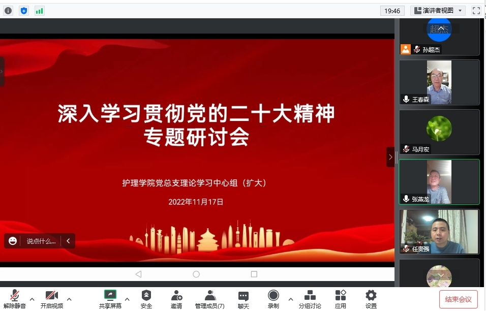 11月17日,护理学院党总支召开理论学习中心组(扩大)专题学习研讨会,专题研讨学习宣传贯彻党的二十大精神。理论学习中心组(扩大)成员分别结合自身感悟和工作实际,进行研讨发言。会议强调,学习宣传贯彻党的二十大精神是当前和今后一个时期的首要政治任务,要争当全面学习、全面把握、全面落实党的二十大精神排头兵,既要整体把握、全面系统,又要突出重点、抓住关键。