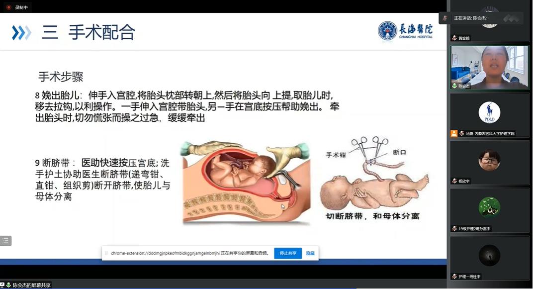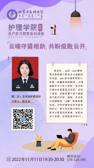 随着新型冠状病毒肺炎疫情的持续发展,我院在有序进行学生返乡工作的同时,仍不忘落实学校“停课不停学、停课不停教”的要求,持续开展本科实习线上教学工作,为丰富线上实习教学内容,11月11日晚,学院邀请海军军医大学第一附属医院(上海长海医院)麻醉科的陈会杰老师为我院实习生开展“手术室护理查房”的生产实习教育讲座。