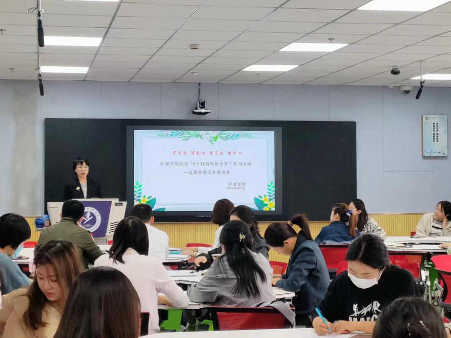 为了深入贯彻学习习近平新时代中国特色社会主义思想主题教育,进一步推进护理学院一流课程建设,提高课程的思政水平,护理学院与健康促进与人文关怀课程思政示范中心于5月9日下午在新华校区教学实验综合楼智慧教室举办了“知行合一、课程思政与教学创新助力一流课程建设体会与分享”讲座。主讲人是基础医学院王磊副研究员,讲座由李翀副院长主持,全体护理学院教师参加了讲座。