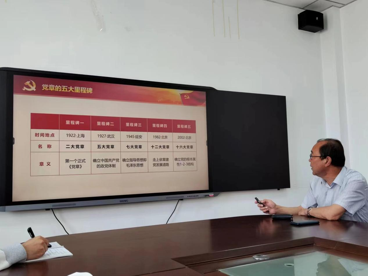 2023年是学习贯彻党的二十大精神的开局之年,为深入学习宣传贯彻党的二十大精神,5月30日,在护理学院六楼会议室,组织开展题为“二十大《中国共产党章程》全面解读”专题党课,党课由党总支书记王春森主讲,第一党支部、第二党支部全体党员参加专题党课学习。内蒙古医科大学党委主题教育第一督促指导小组成员李静老师出席指导。