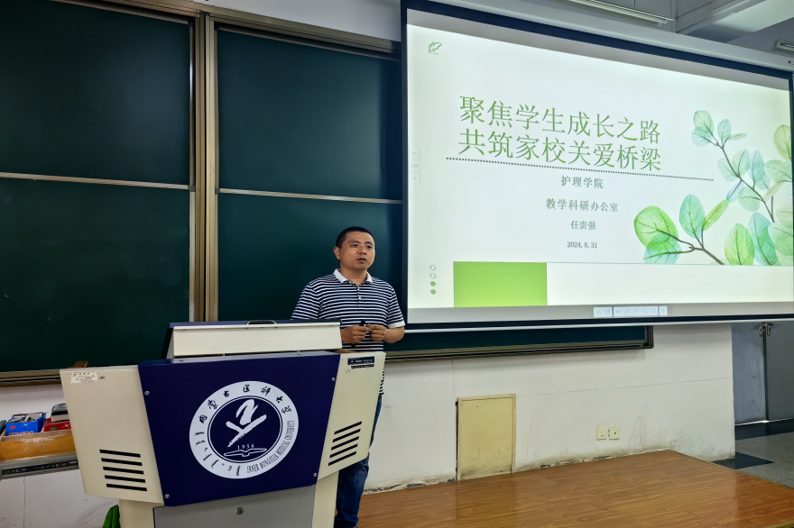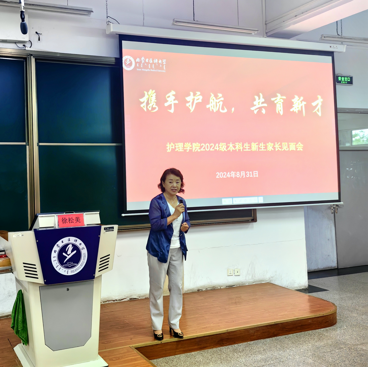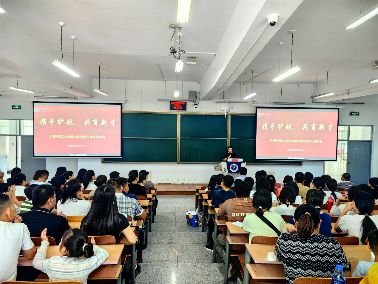 云天渐敛夏色,木叶轻摇秋声。在如此美好的时节,护理学院迎来了怀揣着梦想与期待的2024级新生。为构筑家校沟通桥梁,增强家校沟通,凝聚思想共识,汇聚育人合力,助力学生全面发展。护理学院于8月31日下午4点在问学堂101教室举办了一场温馨而庄重的新生家长见面会。见面会由学院党委副书记周妹主持,学院党委书记徐松美、院长包丽丽、副院长李翀、副院长冯耀清、教科研办副主任任贵强、护理临床实践中心主任马腾、学工办负责人田晗、2024级新生班主任以及学工办全体辅导员出席了会议。