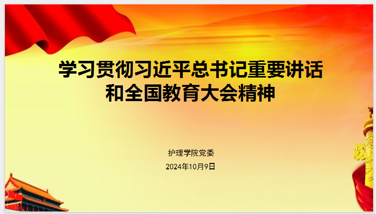 为深入学习贯彻习近平总书记重要讲话和全国教育大会精神,护理学院党委于2024年10月9日下午3:30召开学习贯彻习近平总书记重要讲话和全国教育大会精神会议,以线上线下相结合的形式进行学习,会议由党委书记徐松美主持,护理学院全体教职工与全体学生党员参加会议。
