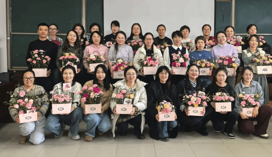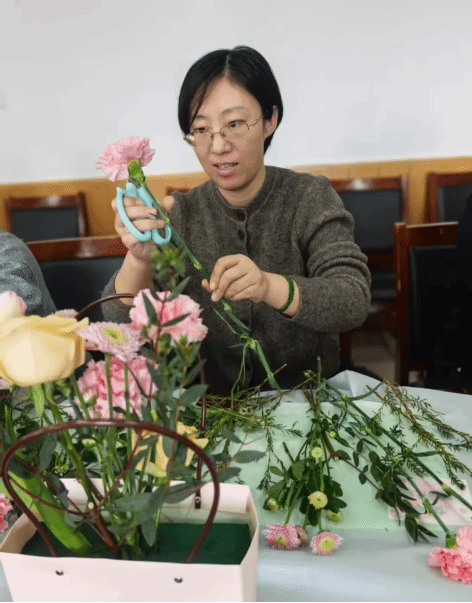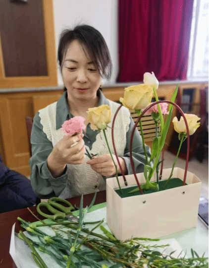 为了让大家更好地领略插花艺术的魅力,活动特别邀请了专业花艺师宿丽进行现场指导。宿丽老师凭借丰富的经验和专业的知识,从花材的挑选甄别、色彩的和谐搭配,到造型的精巧设计等多个方面展开了细致入微的讲解,并亲自示范了插花的基础技巧和关键步骤。在轻松欢快的氛围中,教职工们纷纷化身为心灵手巧的 “花艺师”。她们手持剪刀,认真修剪枝叶,精心构思作品的层次布局,将娇艳的玫瑰、温馨的康乃馨、充满活力的扶郎花等多种花材巧妙组合在一起。大家一边专注创作,一边相互交流分享插花心得,现场花香四溢,欢声笑语此起彼伏。